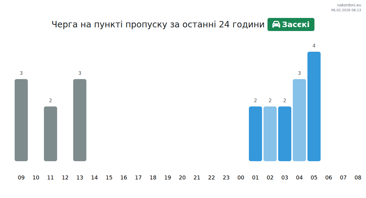 На пункт Засеки очаквайте време за изчакване за леки автомобили между 15-39 минути. Избягвайте пиковите часове в 06:00, 08:00 и 20:00 ч. Най-добрите часове за преминаване през Засеки са 01:00, 03:00 и 05:00 ч.