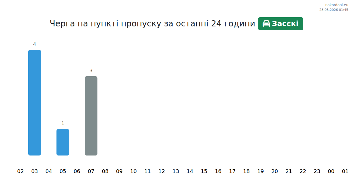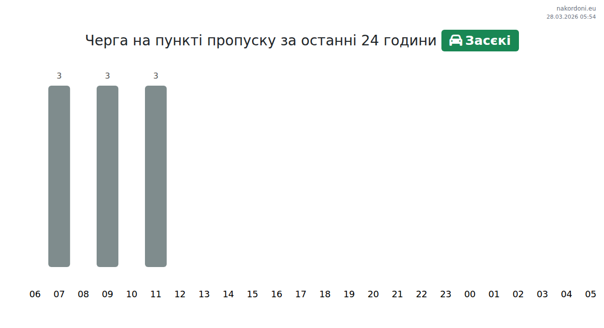 Today at Zasieki the expected queue for passenger cars is 15–39 minutes. Peak hours: 16:00, 18:00, 22:00. Best crossing times: 01:00, 03:00, 05:00. Average wait throughout the day is around 23 minutes. Forecast accounts for daily patterns and current conditions.