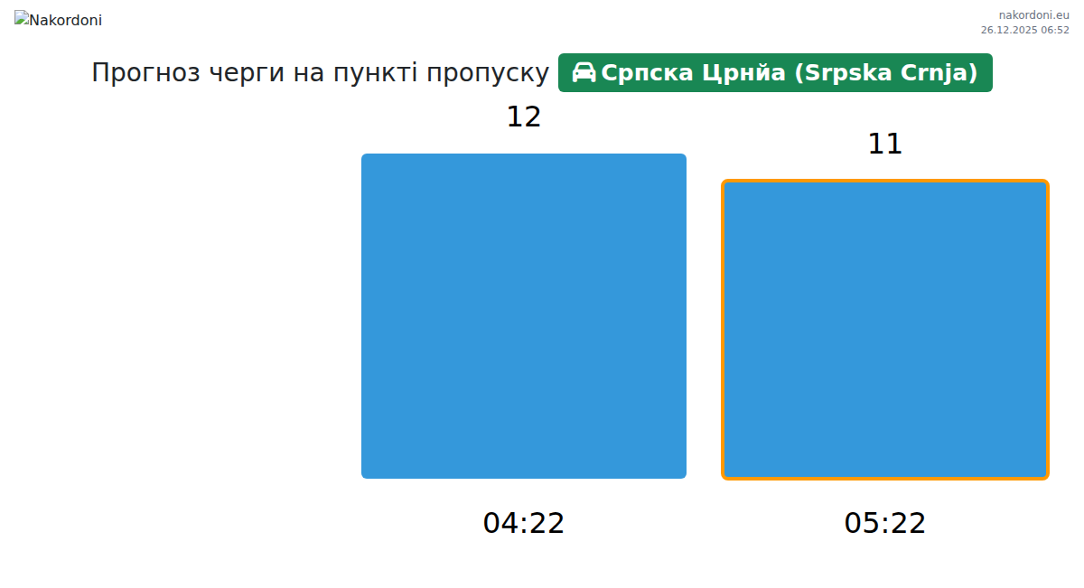 За період 25.12.2025 з 00:00 по 23:59 на кордоні на пункті пропуску Српска Црнйа (Srpska Crnja) - легковий автомобіль були зафіксовані наступні ключові моменти: