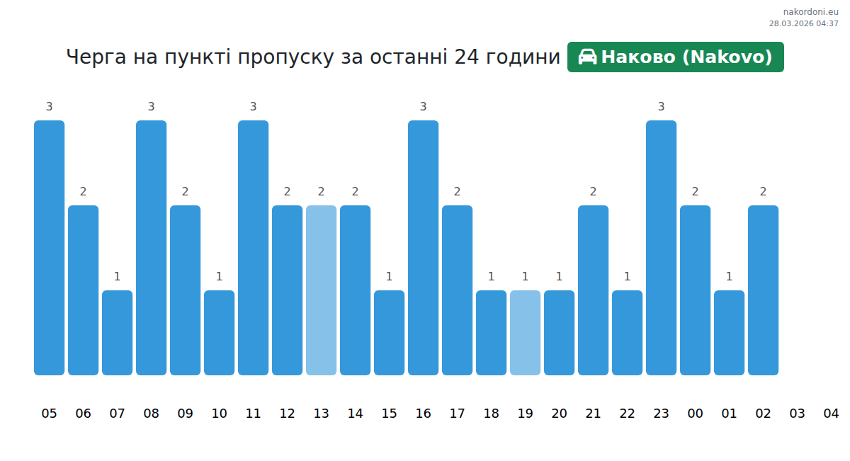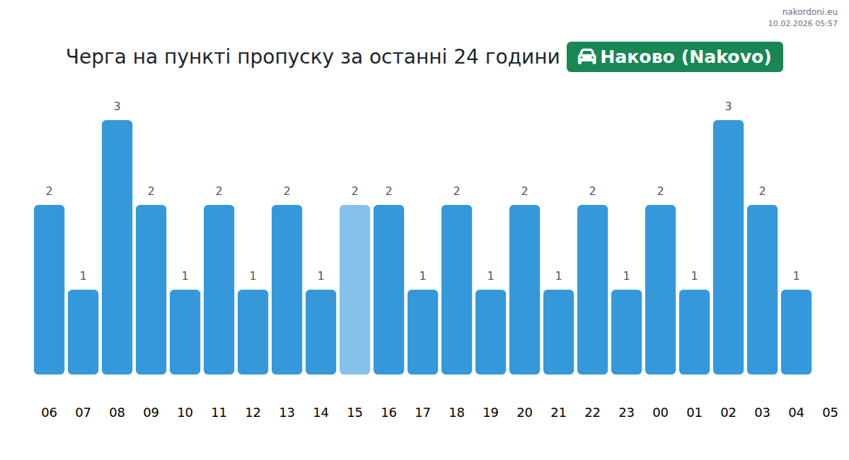 За да избегнете дълги опашки на границата на КПП Наково (Nakovo) - лек автомобил, препоръчваме да планирате преминаването на границата в часовете с най-малко натоварване. Според данните от изминалия ден, най-малкият брой превозни средства е наблюдаван между :00 и 3:00 часа. Това е идеалното време за преминаване на границата, за да спестите време и да избегнете закъснения.