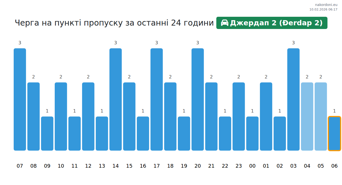 За да избегнете дълги опашки на границата на КПП Джердап 2 (Đerdap 2) - лек автомобил, препоръчваме да планирате преминаването на границата в часовете с най-малко натоварване. Според данните от изминалия ден, най-малкият брой превозни средства е наблюдаван между 2:00 и 4:00 часа. Това е идеалното време за преминаване на границата, за да спестите време и да избегнете закъснения.