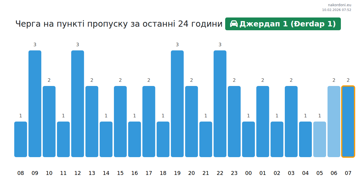 За да избегнете дълги опашки на границата на КПП Джердап 1 (Đerdap 1) - лек автомобил, препоръчваме да планирате преминаването на границата в часовете с най-малко натоварване. Според данните от изминалия ден, най-малкият брой превозни средства е наблюдаван между :00 и 3:00 часа. Това е идеалното време за преминаване на границата, за да спестите време и да избегнете закъснения.