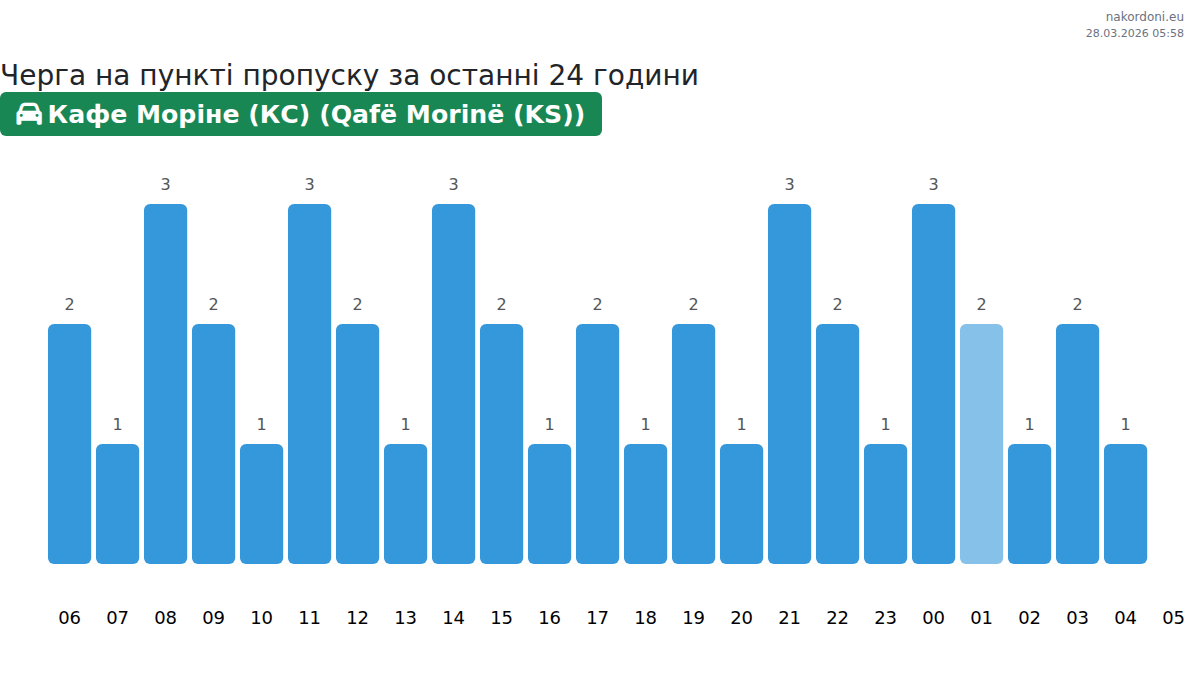 За да избегнете дълги опашки на границата на КПП Кафе Морине (КС) (Qafë Morinë (KS)) - лек автомобил, препоръчваме да планирате преминаването на границата в часовете с най-малко натоварване. Според данните от изминалия ден, най-малкият брой превозни средства е наблюдаван между :00 и 2:00 часа. Това е идеалното време за преминаване на границата, за да спестите време и да избегнете закъснения.