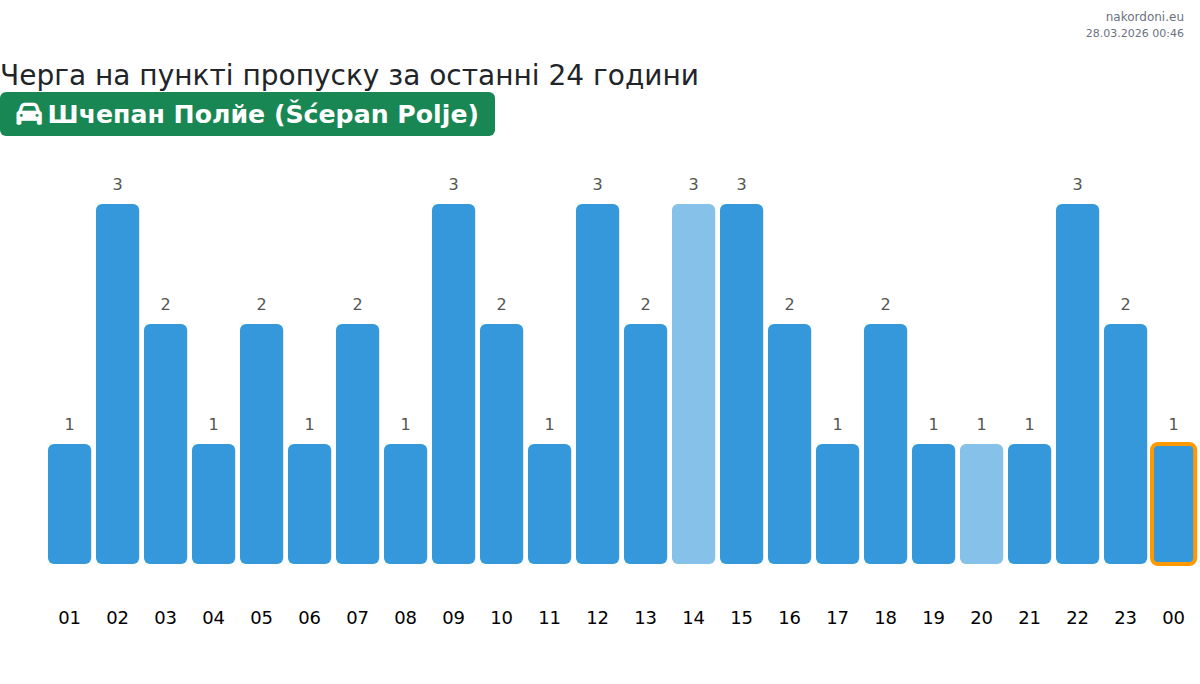 За да избегнете дълги опашки на границата на КПП Шчепан Полйе (Šćepan Polje) - лек автомобил, препоръчваме да планирате преминаването на границата в часовете с най-малко натоварване. Според данните от изминалия ден, най-малкият брой превозни средства е наблюдаван между :00 и 3:00 часа. Това е идеалното време за преминаване на границата, за да спестите време и да избегнете закъснения.