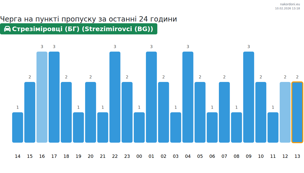 Планирайте пътуванията си предварително, като използвате актуална информация за опашките на границата на КПП Стрезимировци (БГ) (Strezimirovci (BG)) - лек автомобил, за да направите преминаването бързо и удобно. Обърнете специално внимание на тези часове, за да избегнете пиковите часове и да намалите времето за чакане.