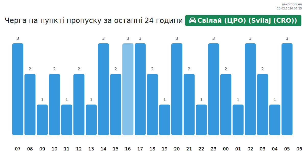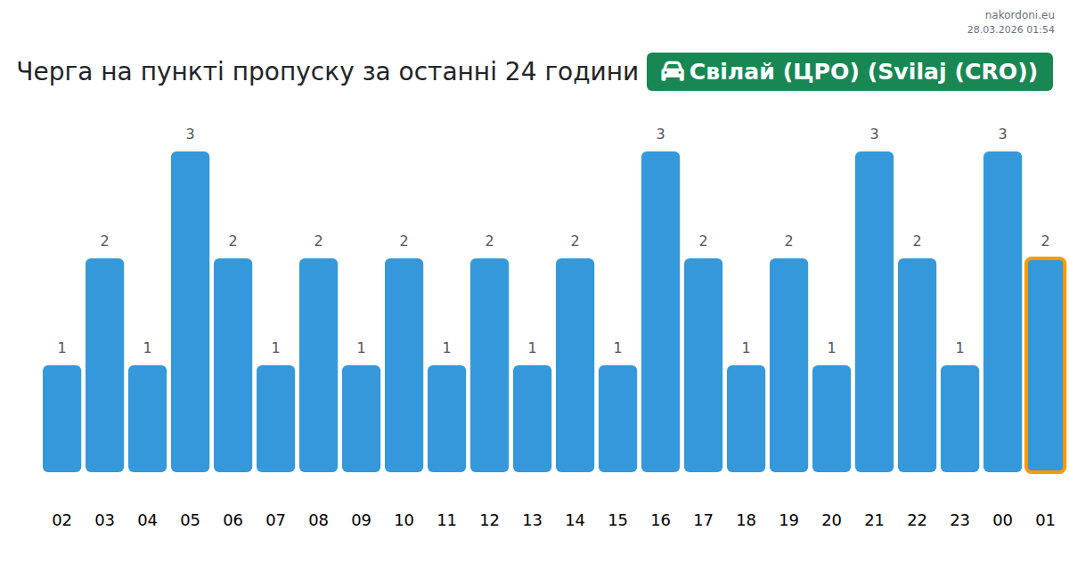 Планирайте пътуванията си предварително, като използвате актуална информация за опашките на границата на КПП Свилай (ЦРО) (Svilaj (CRO)) - лек автомобил, за да направите преминаването бързо и удобно. Обърнете специално внимание на тези часове, за да избегнете пиковите часове и да намалите времето за чакане.