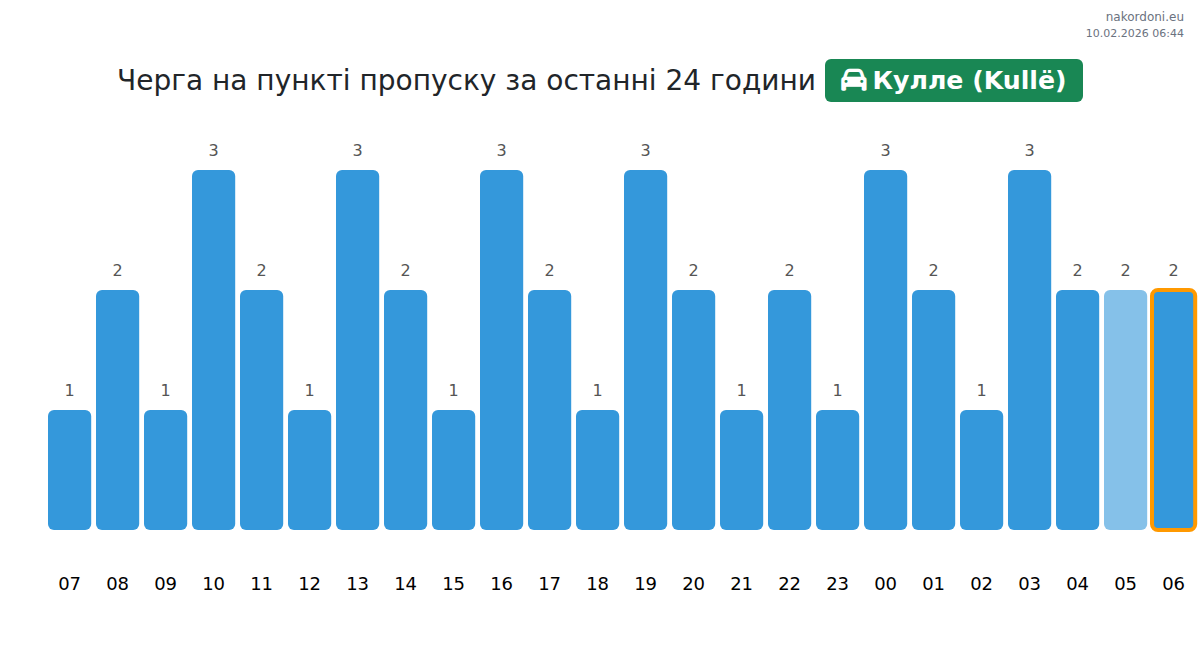 За да избегнете дълги опашки на границата на КПП Кулле (Kullë) - лек автомобил, препоръчваме да планирате преминаването на границата в часовете с най-малко натоварване. Според данните от изминалия ден, най-малкият брой превозни средства е наблюдаван между :00 и 3:00 часа. Това е идеалното време за преминаване на границата, за да спестите време и да избегнете закъснения.