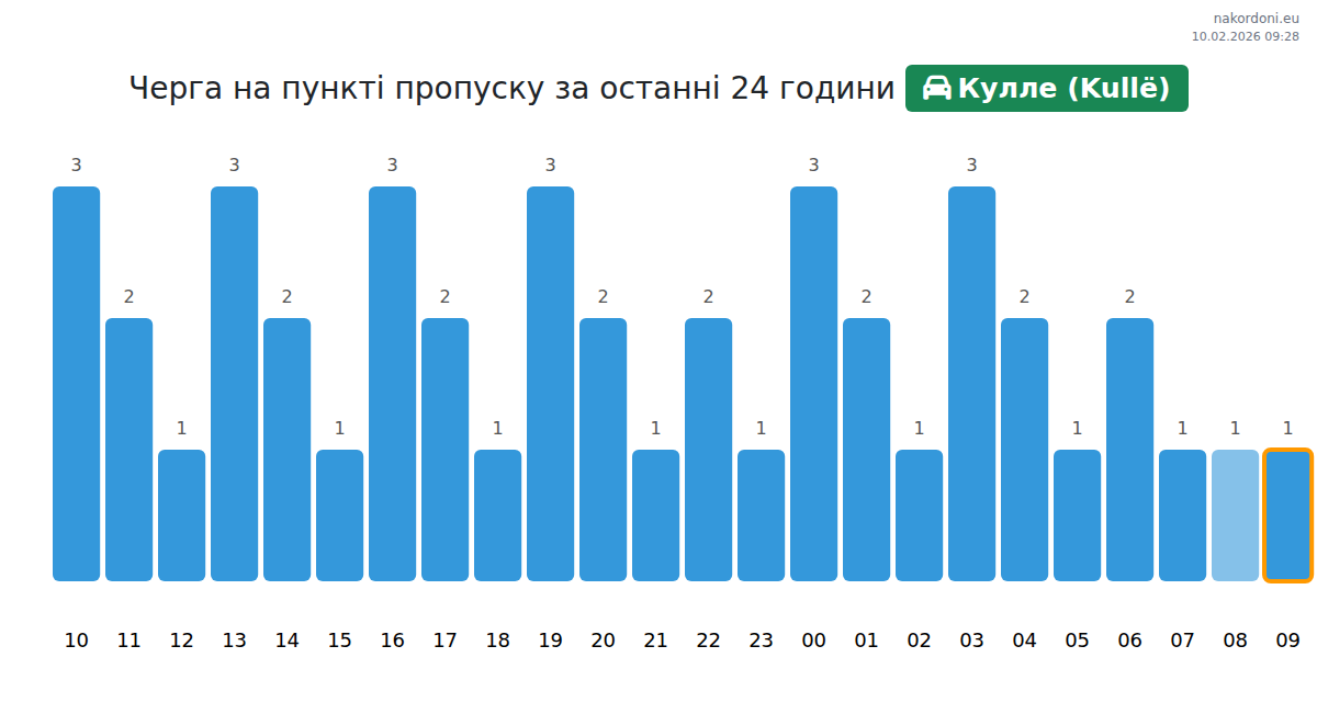 За периода 09.02.2026 от 00:00 до 23:59 на границата на КПП Кулле (Kullë) - лек автомобил бяха записани следните ключови моменти: