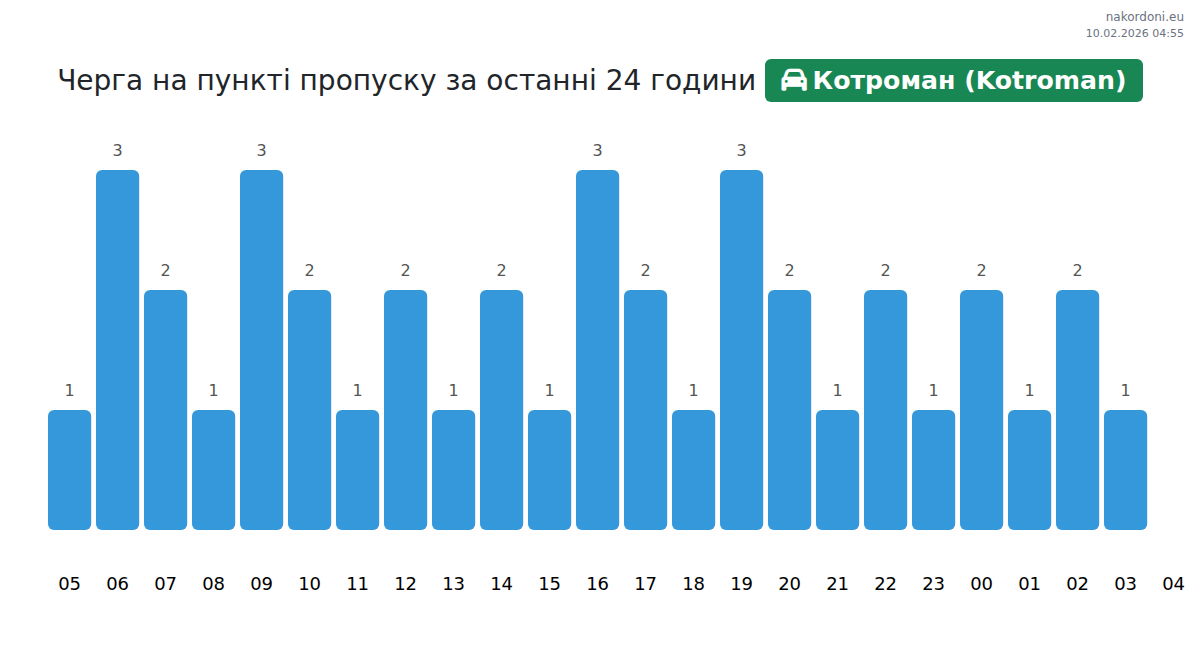 На ГКПП Котроман (Kotroman) за леки автомобили се очаква време за изчакване от 20 до 30 минути. Препоръчително е да избягвате пиковите часове: 14:00, 15:00 и 17:00. Най-кратки опашки се очакват между 01:00 и 03:00.