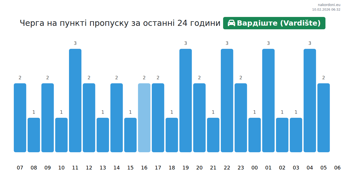 На пункта **Вардиште (Vardište)** очакваното време за изчакване за леки автомобили е 20-25 минути. Избягвайте пиковите часове: 12:00, 14:00 и 15:00. За минимални закъснения преминавайте между 01:00 и 03:00.