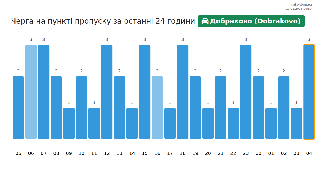 За да избегнете дълги опашки на границата на КПП Добраково (Dobrakovo) - лек автомобил, препоръчваме да планирате преминаването на границата в часовете с най-малко натоварване. Според данните от изминалия ден, най-малкият брой превозни средства е наблюдаван между 1:00 и 3:00 часа. Това е идеалното време за преминаване на границата, за да спестите време и да избегнете закъснения.