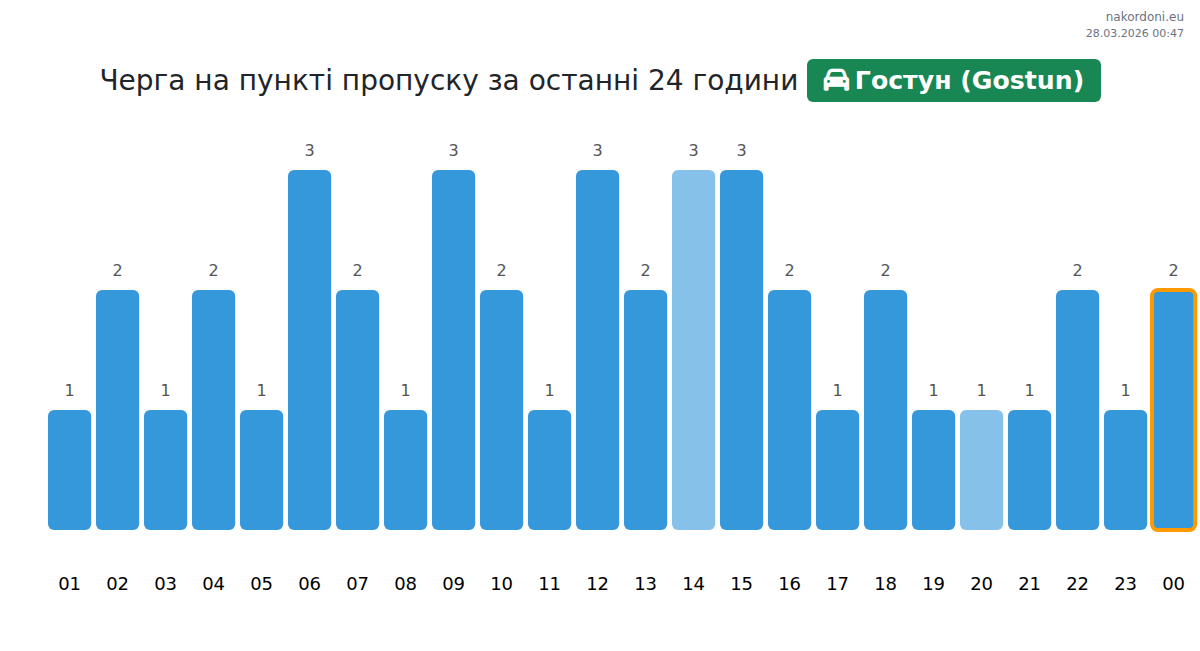 За да избегнете дълги опашки на границата на КПП Гостун (Gostun) - лек автомобил, препоръчваме да планирате преминаването на границата в часовете с най-малко натоварване. Според данните от изминалия ден, най-малкият брой превозни средства е наблюдаван между :00 и 2:00 часа. Това е идеалното време за преминаване на границата, за да спестите време и да избегнете закъснения.