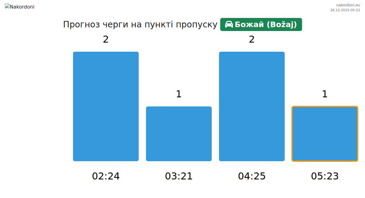 Плануйте свої поїздки заздалегідь, використовуючи актуальну інформацію про черги на кордоні на пункті пропуску Божай (Božaj) - легковий автомобіль, щоб зробити ваш перетин швидким і зручним. Приділіть особливу увагу цим годинам, щоб уникнути пікового навантаження і зменшити час очікування.