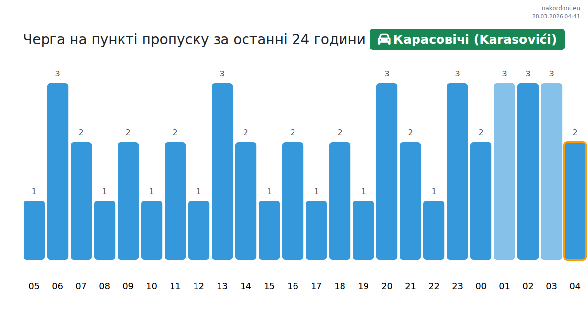 За да избегнете дълги опашки на границата на КПП Карасовичи (Karasovići) - лек автомобил, препоръчваме да планирате преминаването на границата в часовете с най-малко натоварване. Според данните от изминалия ден, най-малкият брой превозни средства е наблюдаван между 2:00 и 5:00 часа. Това е идеалното време за преминаване на границата, за да спестите време и да избегнете закъснения.