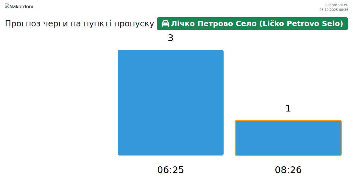 Для уникнення довгих черг на кордоні на пункті пропуску Лічко Петрово Село (Ličko Petrovo Selo) - легковий автомобіль, рекомендуємо планувати перетин кордону в години найменшого навантаження. Згідно з даними за минулу добу, найменша кількість автомобілів спостерігалася між 11:00 та 13:00 годинами. Це ідеальний час для перетину кордону, щоб зекономити час і уникнути затримок.