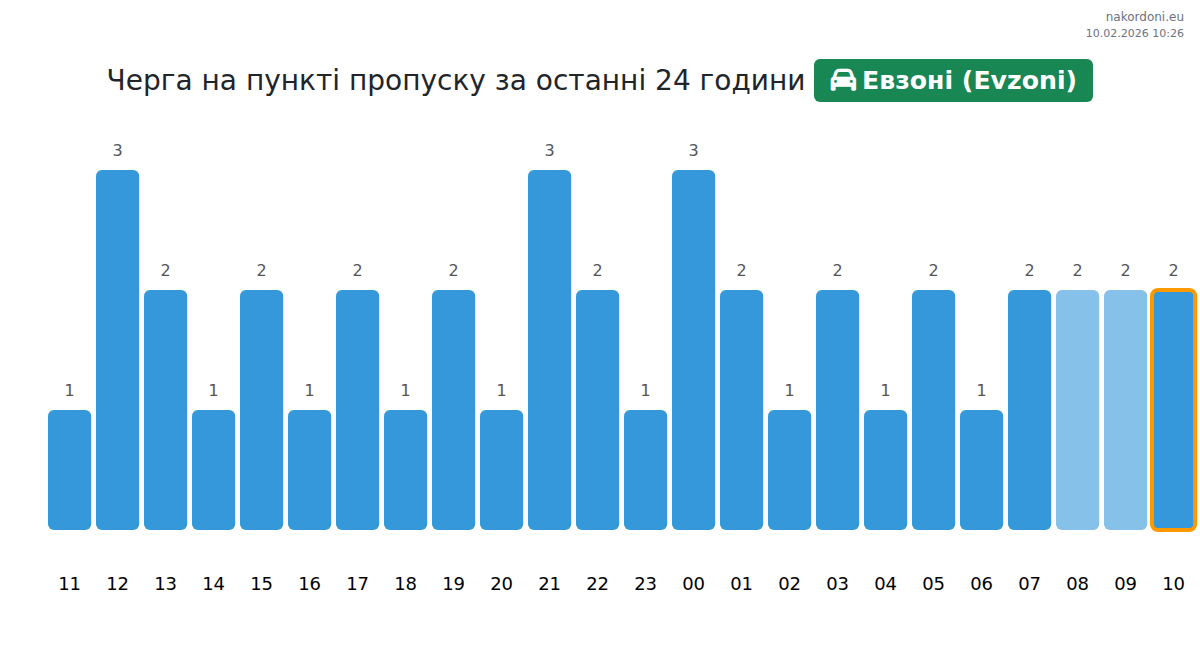 За периода 09.02.2026 от 00:00 до 23:59 на границата на КПП Евзони (Evzoni) - лек автомобил бяха записани следните ключови моменти: