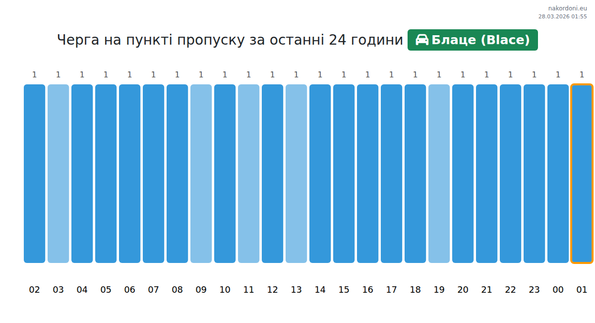 За да избегнете дълги опашки на границата на КПП Блаце (Blace) - лек автомобил, препоръчваме да планирате преминаването на границата в часовете с най-малко натоварване. Според данните от изминалия ден, най-малкият брой превозни средства е наблюдаван между :00 и 1:00 часа. Това е идеалното време за преминаване на границата, за да спестите време и да избегнете закъснения.