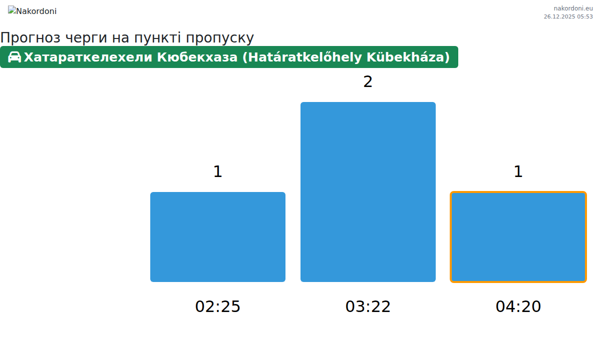 За період 25.12.2025 з 00:00 по 23:59 на кордоні на пункті пропуску Хатараткелехели Кюбекхаза (Határatkelőhely Kübekháza) - легковий автомобіль були зафіксовані наступні ключові моменти: