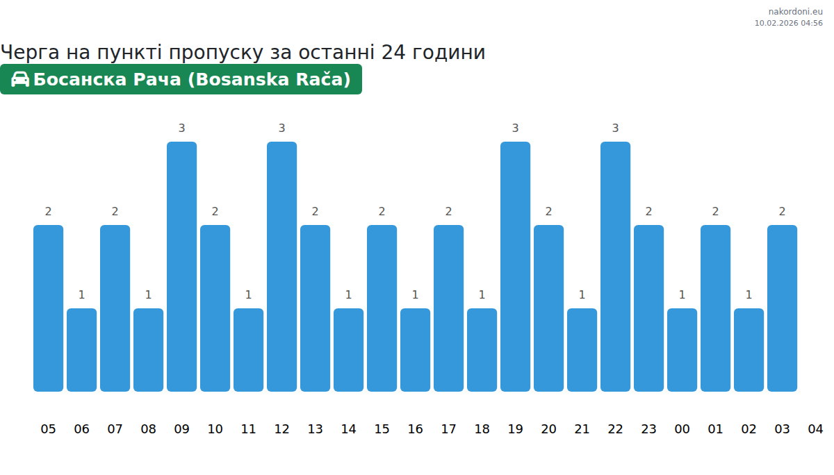 На пункта Босанска Рача (Босанска Рача) очакваното време за изчакване на леки автомобили е между 20-55 минути. За да избегнете пиковите часове, избягвайте 10:00, 15:00 и 14:00. Най-кратките опашки обикновено са около 01:00, 04:00 и 05:00.