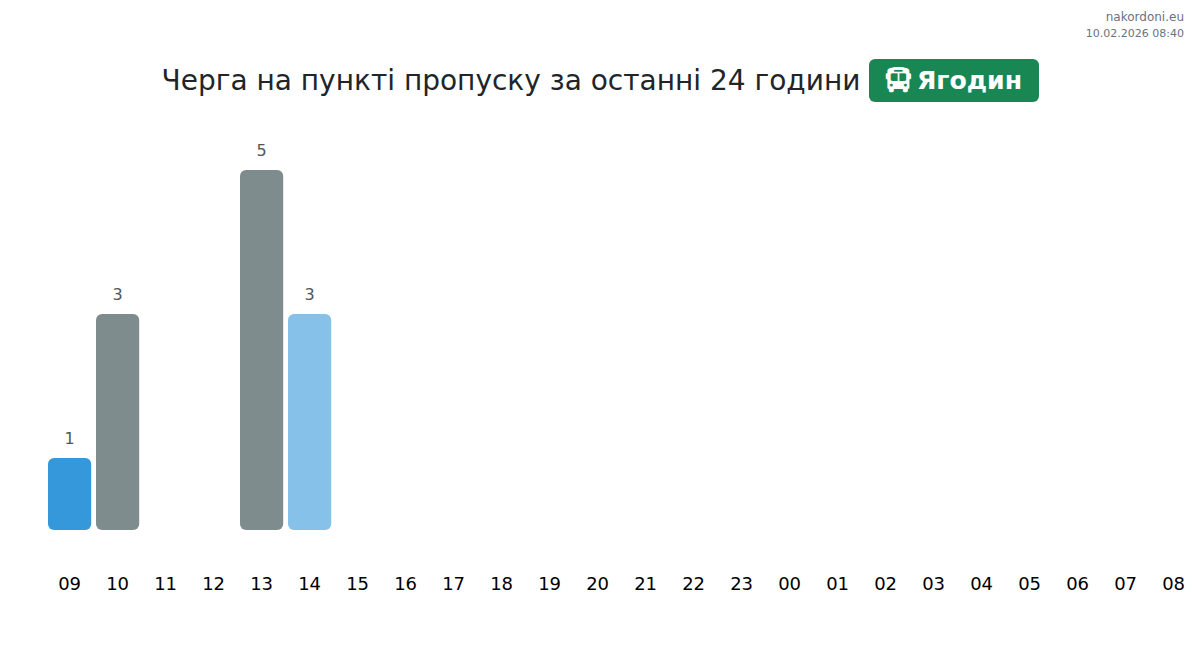 На ГКПП Ягодин се очаква изчакване на автобуси 15-575 минути. Избягвайте пиковите часове (11:00, 02:00, 13:00 ч.). Най-доброто време за преминаване е 00:00, 05:00 и 06:00 ч.