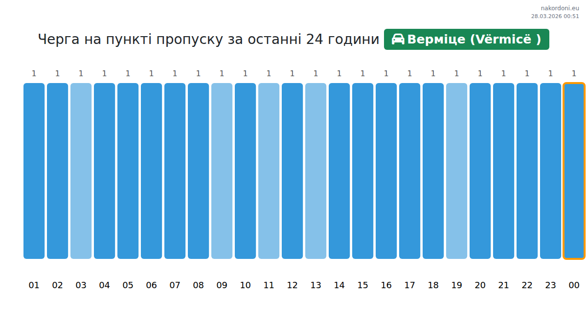 За да избегнете дълги опашки на границата на КПП Вермице (Vërmicë ) - лек автомобил, препоръчваме да планирате преминаването на границата в часовете с най-малко натоварване. Според данните от изминалия ден, най-малкият брой превозни средства е наблюдаван между :00 и 1:00 часа. Това е идеалното време за преминаване на границата, за да спестите време и да избегнете закъснения.