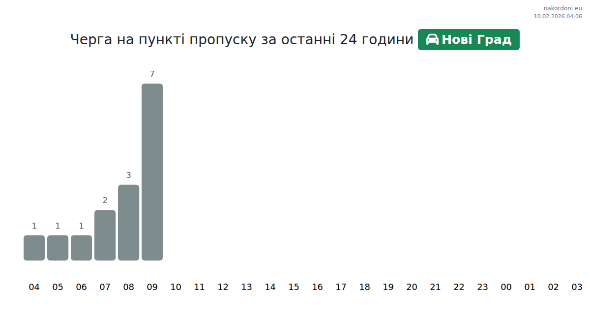 На Нови Град очаквайте време за изчакване за леки автомобили между 71-113 минути. Избягвайте пиковите часове: 09:00, 10:00 и 12:00. Най-кратките опашки са обикновено в 01:00, 02:00 и 03:00.