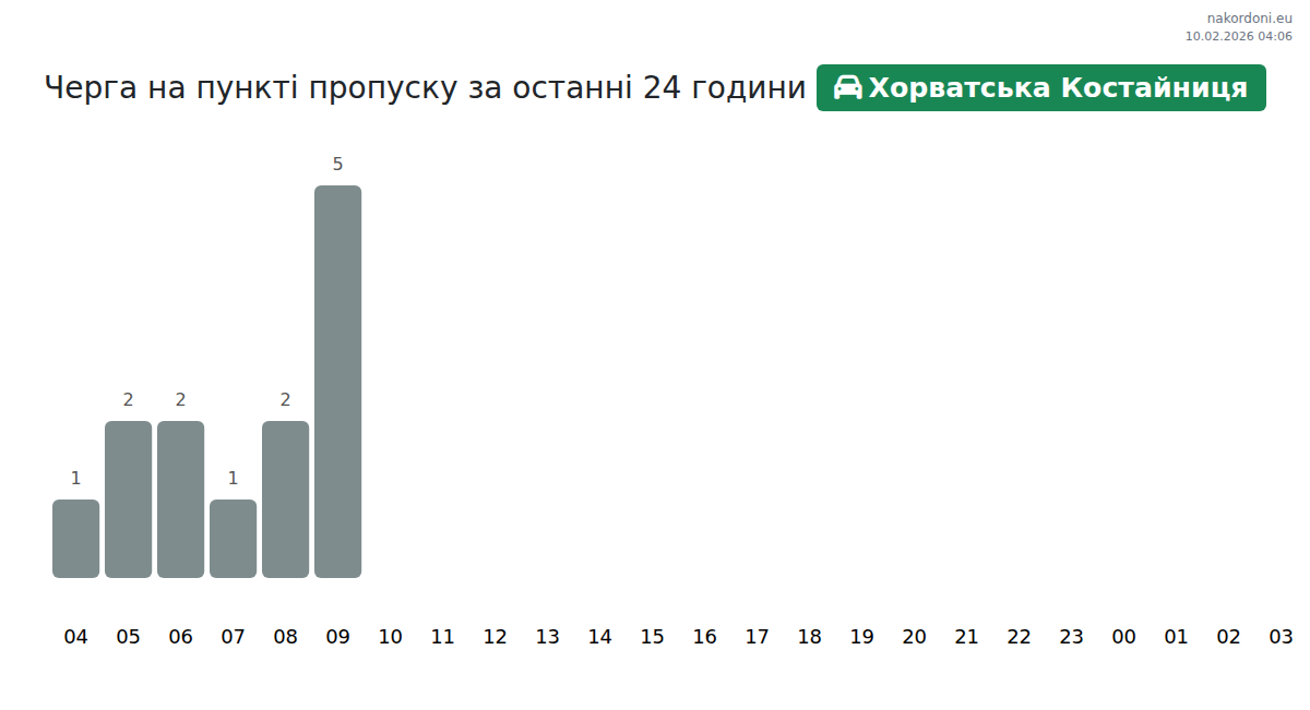 На Хорватська Костайниця времето за изчакване е 71-119 минути за коли. Избягвайте пиковите часове (11:00, 13:00, 14:00) за по-кратко чакане. Най-кратките опашки са между 23:00 и 01:00.