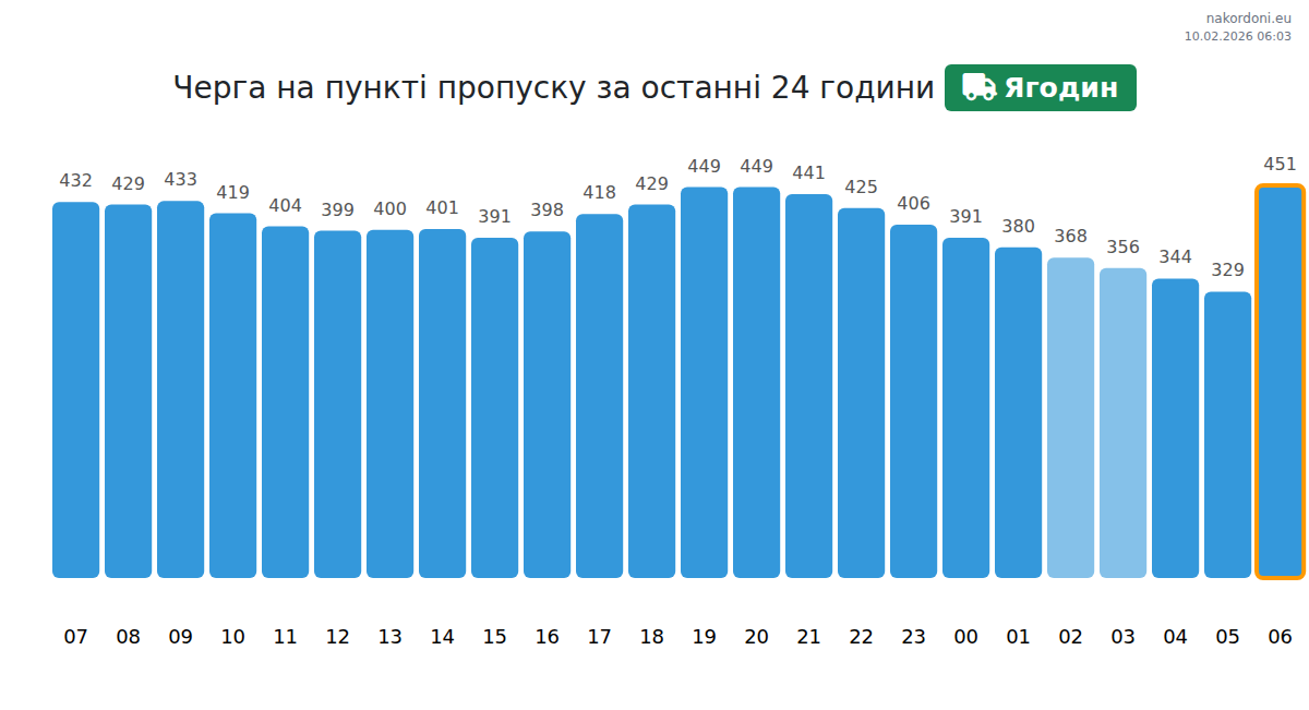 За Ягодин, времето за изчакване на превозни средства се прогнозира между 15 и 35535 минути. Избягвайте пиковите часове в 19:00, 20:00 и 23:00. Най-кратки опашки се очакват в 02:00, 03:00 и 06:00.