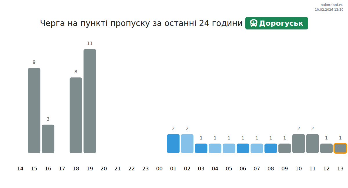 На Дорогуськ очакваното време за изчакване за автобуси е между 95 и 1775 минути. Избягвайте пиковите часове в 05:00, 08:00 и 13:00 за по-бързо преминаване. Най-добрите часове за преминаване са 01:00, 22:00 и 03:00.