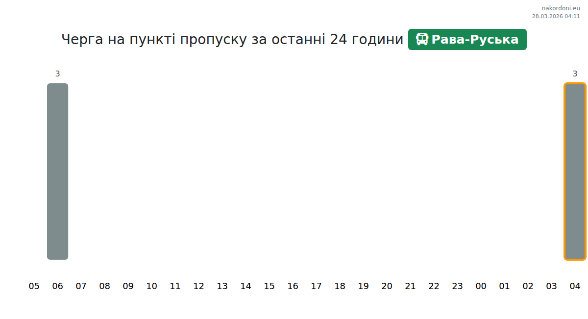 At Rava-Ruska until end of tomorrow, expected queue is 15–495 minutes for buses. Peak hours: 10:00, 01:00, 08:00. Shortest queues expected at 21:00, 00:00, 05:00. Tonight and tomorrow morning traffic will be moderate.