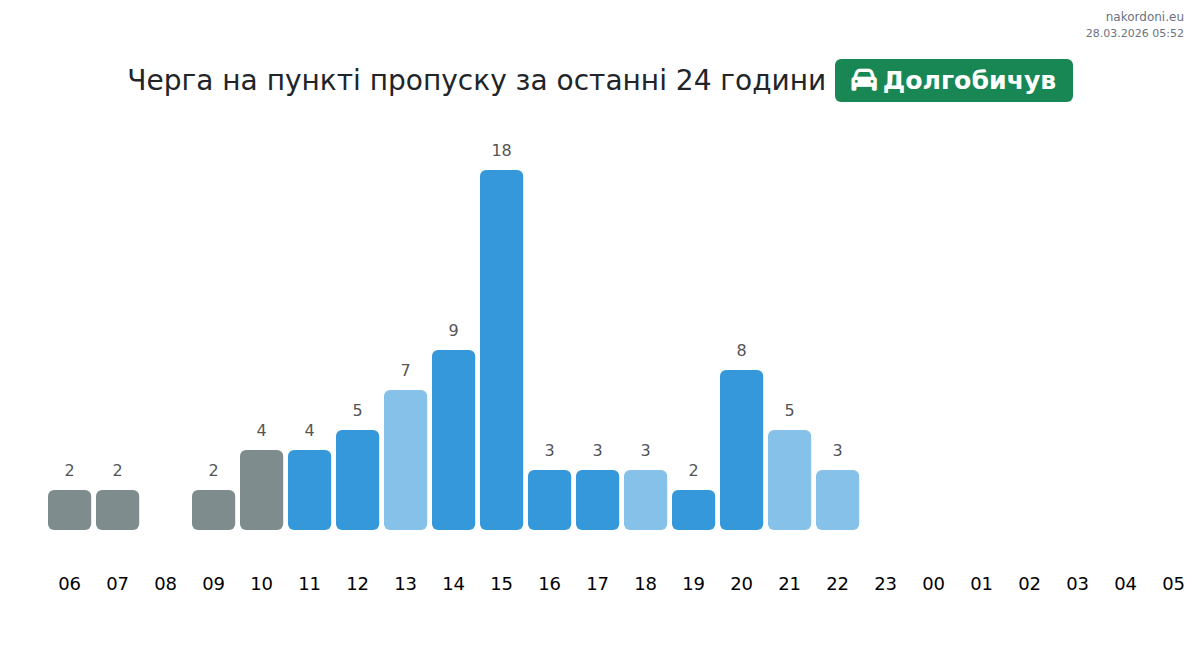 Today at Dolgobychuv the expected queue for passenger cars is 15–159 minutes. Peak hours: 18:00, 02:00, 03:00. Best crossing times: 22:00, 00:00, 06:00. Average wait throughout the day is around 61 minutes. Forecast accounts for daily patterns and current conditions.