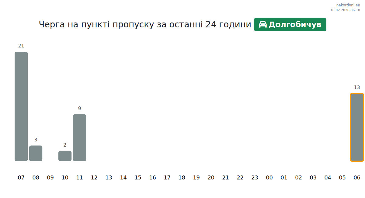 На пункт Долгобичув, очакваното време за изчакване за леки автомобили е от 15 до 2215 минути. Избягвайте преминаване около 23:00, 02:00 и 20:00 ч., тъй като това са пиковите часове. За по-кратки опашки, помислете за преминаване в 08:00, 12:00 или 16:00 ч.