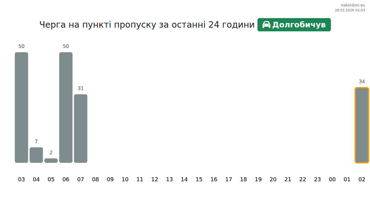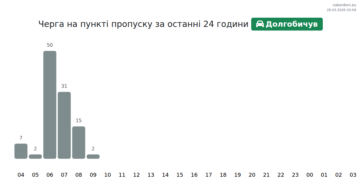 At Dolgobychuv until end of tomorrow, expected queue is 15–2495 minutes for passenger cars. Peak hours: 09:00, 13:00, 14:00. Shortest queues expected at 12:00, 17:00, 04:00. Tonight and tomorrow morning traffic will be moderate.
