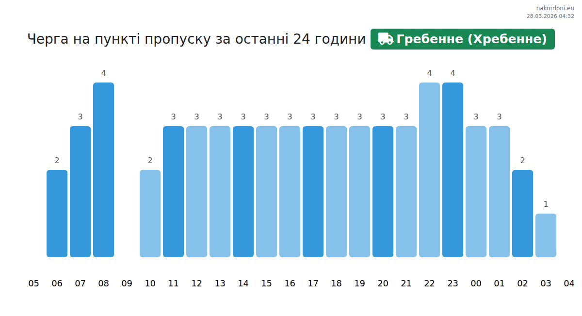 За да избегнете дълги опашки на границата на КПП Гребенне (Хребенне) - товарен транспорт, препоръчваме да планирате преминаването на границата в часовете с най-малко натоварване. Според данните от изминалия ден, най-малкият брой превозни средства е наблюдаван между 5:00 и 23:00 часа. Това е идеалното време за преминаване на границата, за да спестите време и да избегнете закъснения.