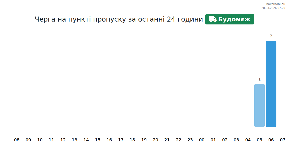 Today at Budomezh the expected queue for trucks is 15–15 minutes. Peak hours: 22:00, 23:00, 00:00. Best crossing times: 01:00, 02:00, 03:00. Average wait throughout the day is around 15 minutes. Forecast accounts for daily patterns and current conditions.