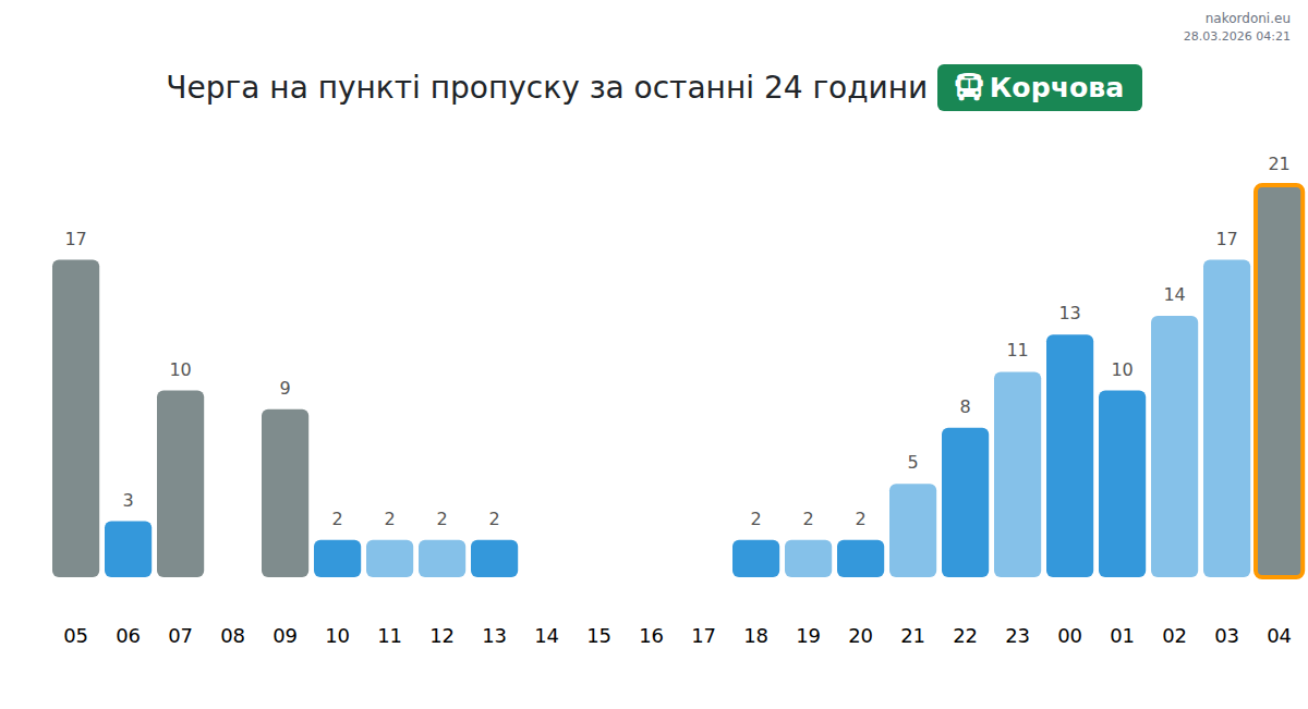 Today at Korchova the expected queue for buses is 15–1055 minutes. Peak hours: 04:00, 03:00, 05:00. Best crossing times: 17:00, 12:00, 15:00. Average wait throughout the day is around 485 minutes. Forecast accounts for daily patterns and current conditions.