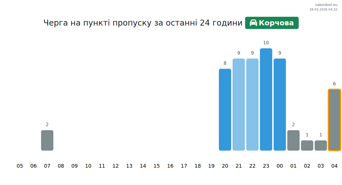 At Korchova until tomorrow noon, expected queue is 15–215 minutes for passenger cars. Peaks: 22:00, 18:00, 20:00. Best crossing times: 19:00, 21:00, 23:00. This evening and tonight traffic is expected to decrease.