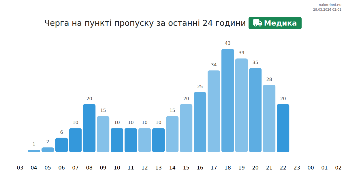 At Medyka until end of tomorrow, expected queue is 15–159 minutes for vehicles. Peak hours: 10:00, 08:00, 20:00. Shortest queues expected at 19:00, 21:00, 22:00. Tonight and tomorrow morning traffic will be moderate.