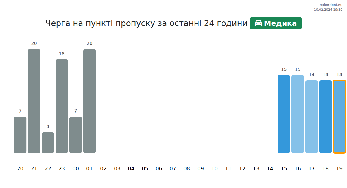 На пункт Медика времето за изчакване за леки автомобили е от 15 до 1895 минути. Избягвайте пиковите часове: 00:00, 16:00 и 04:00. Най-доброто време е 03:00, 05:00 и 09:00.