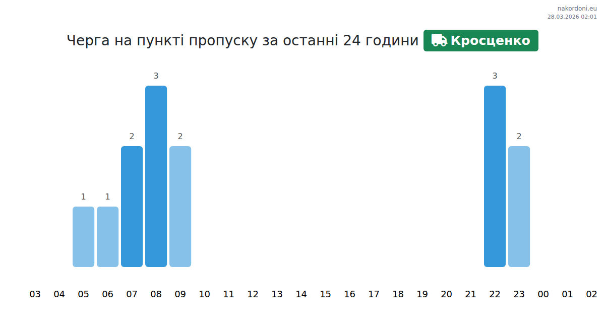 За да избегнете дълги опашки на границата на КПП Кросценко - товарен транспорт (до 7,5 тона), препоръчваме да планирате преминаването на границата в часовете с най-малко натоварване. Според данните от изминалия ден, най-малкият брой превозни средства е наблюдаван между 1:00 и 4:00 часа. Това е идеалното време за преминаване на границата, за да спестите време и да избегнете закъснения.