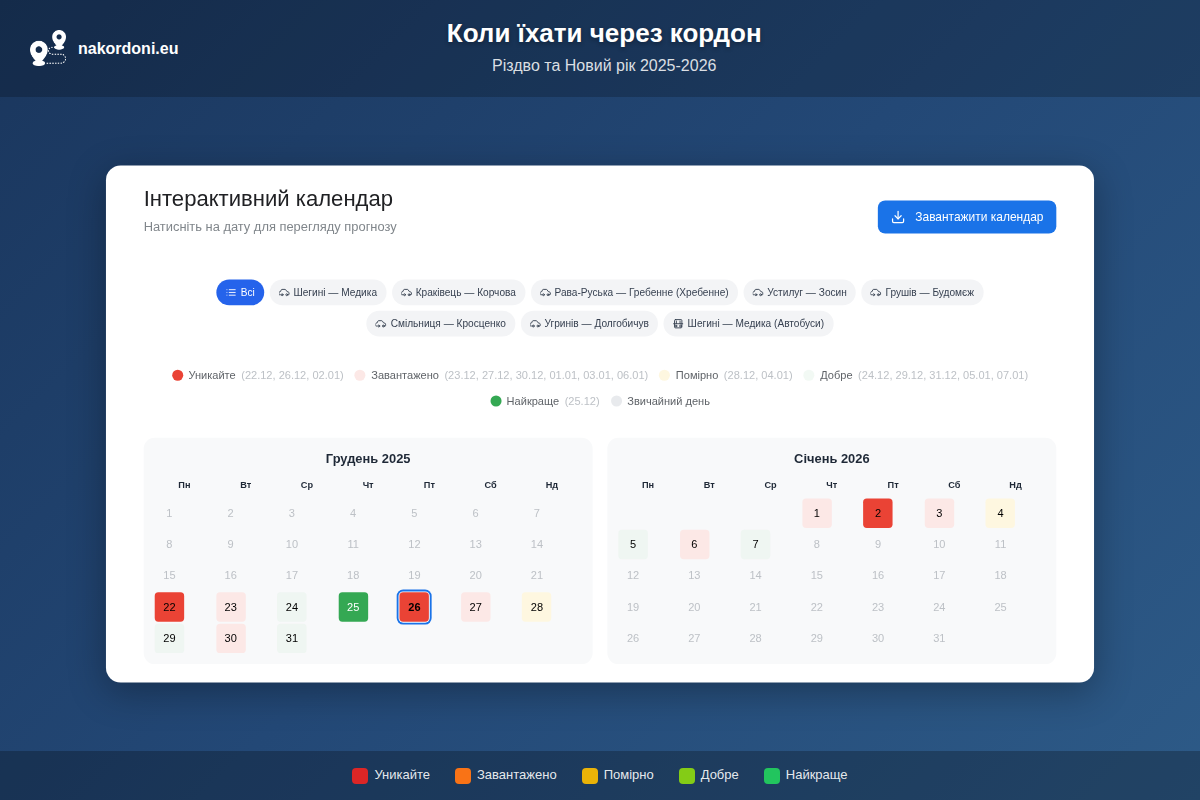 У святковий період 22.12–07.01.2026 очікується підвищене навантаження на кордоні. Ми відстежуємо черги на 16 пунктах пропуску в реальному часі.