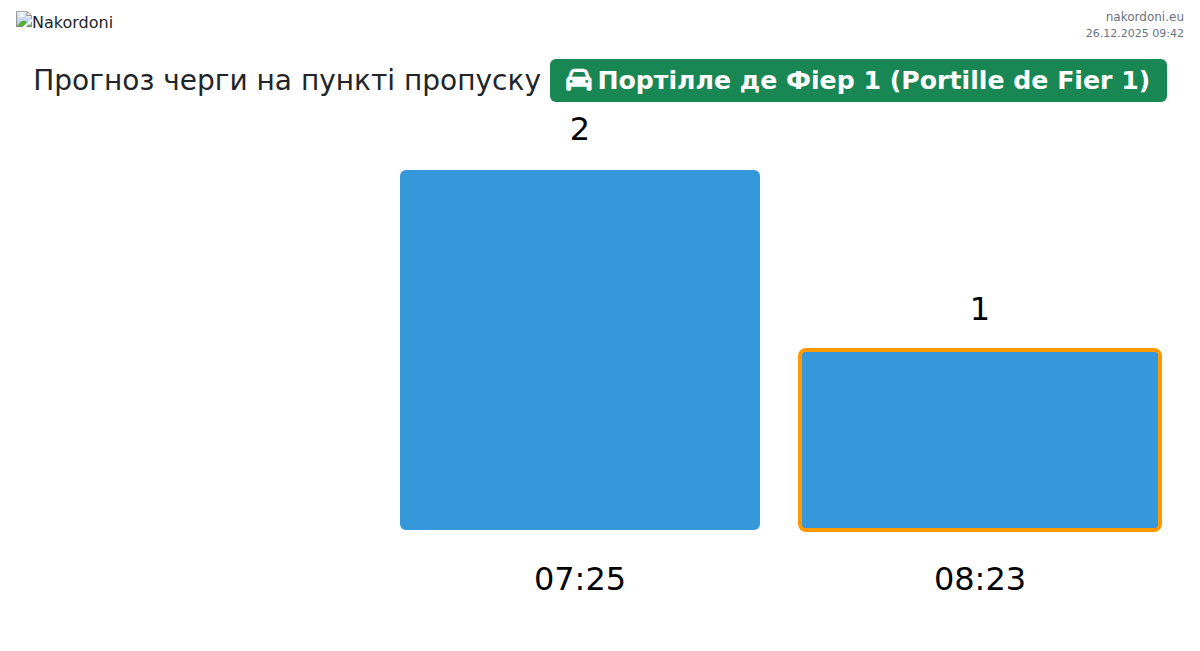 Для уникнення довгих черг на кордоні на пункті пропуску Портілле де Фіер 1 (Portille de Fier 1) - легковий автомобіль, рекомендуємо планувати перетин кордону в години найменшого навантаження. Згідно з даними за минулу добу, найменша кількість автомобілів спостерігалася між 2:00 та 4:00 годинами. Це ідеальний час для перетину кордону, щоб зекономити час і уникнути затримок.