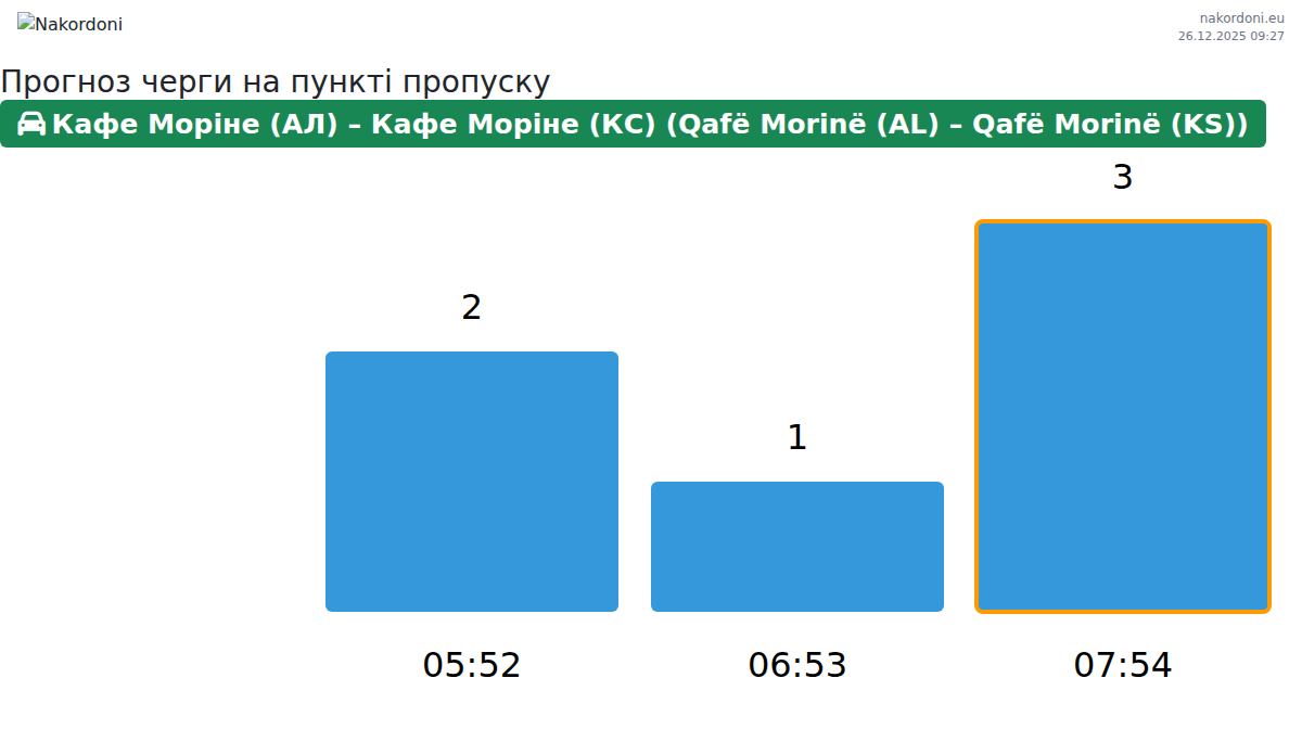 Для уникнення довгих черг на кордоні на пункті пропуску Кафе Моріне (АЛ) – Кафе Моріне (КС) (Qafë Morinë (AL) – Qafë Morinë (KS)) - легковий автомобіль, рекомендуємо планувати перетин кордону в години найменшого навантаження. Згідно з даними за минулу добу, найменша кількість автомобілів спостерігалася між :00 та 3:00 годинами. Це ідеальний час для перетину кордону, щоб зекономити час і уникнути затримок.