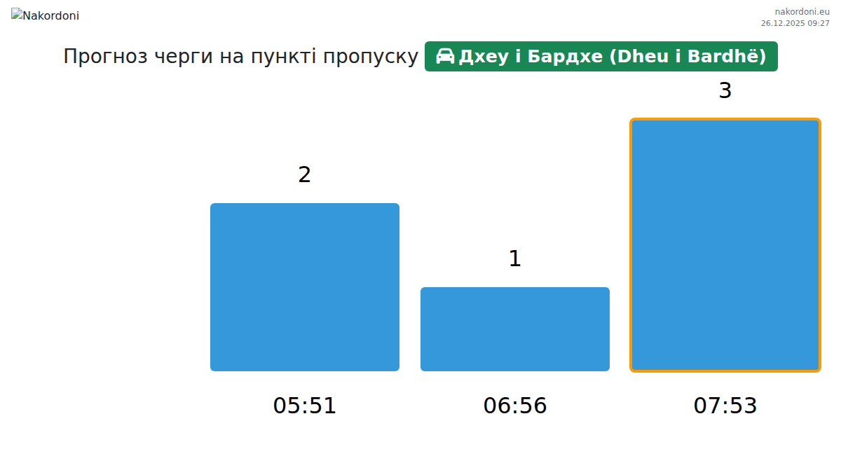 Для уникнення довгих черг на кордоні на пункті пропуску Дхеу і Бардхе (Dheu i Bardhë) - легковий автомобіль, рекомендуємо планувати перетин кордону в години найменшого навантаження. Згідно з даними за минулу добу, найменша кількість автомобілів спостерігалася між 2:00 та 5:00 годинами. Це ідеальний час для перетину кордону, щоб зекономити час і уникнути затримок.