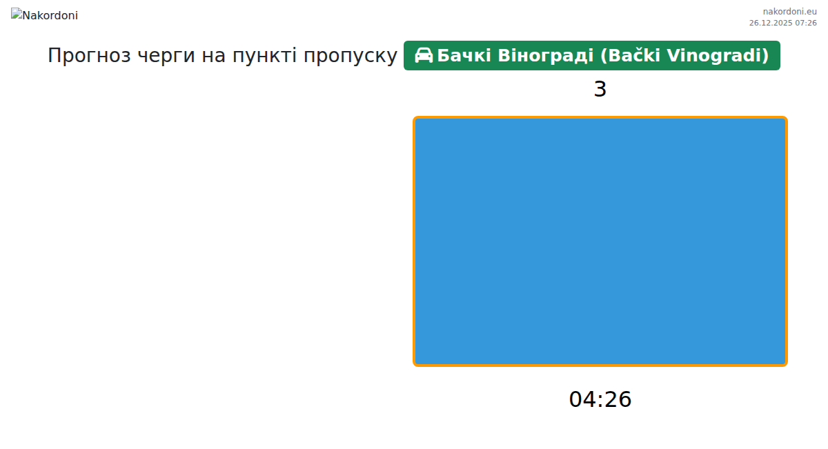 За період 25.12.2025 з 00:00 по 23:59 на кордоні на пункті пропуску Бачкі Вінограді (Bački Vinogradi) - легковий автомобіль були зафіксовані наступні ключові моменти: