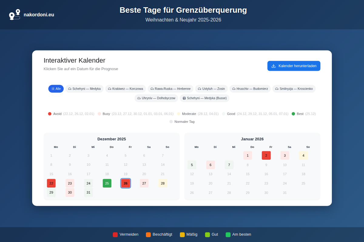 Wenn Sie vor Weihnachten (22.–23. Dezember) nach Polen oder in andere EU-Länder reisen oder Tage danach bevorzugen, sind die optimalen Daten 27., 28., 29. Dezember. Die meisten sind bereits angekommen, daher sinken die Wartezeiten auf 90–120 Minuten.