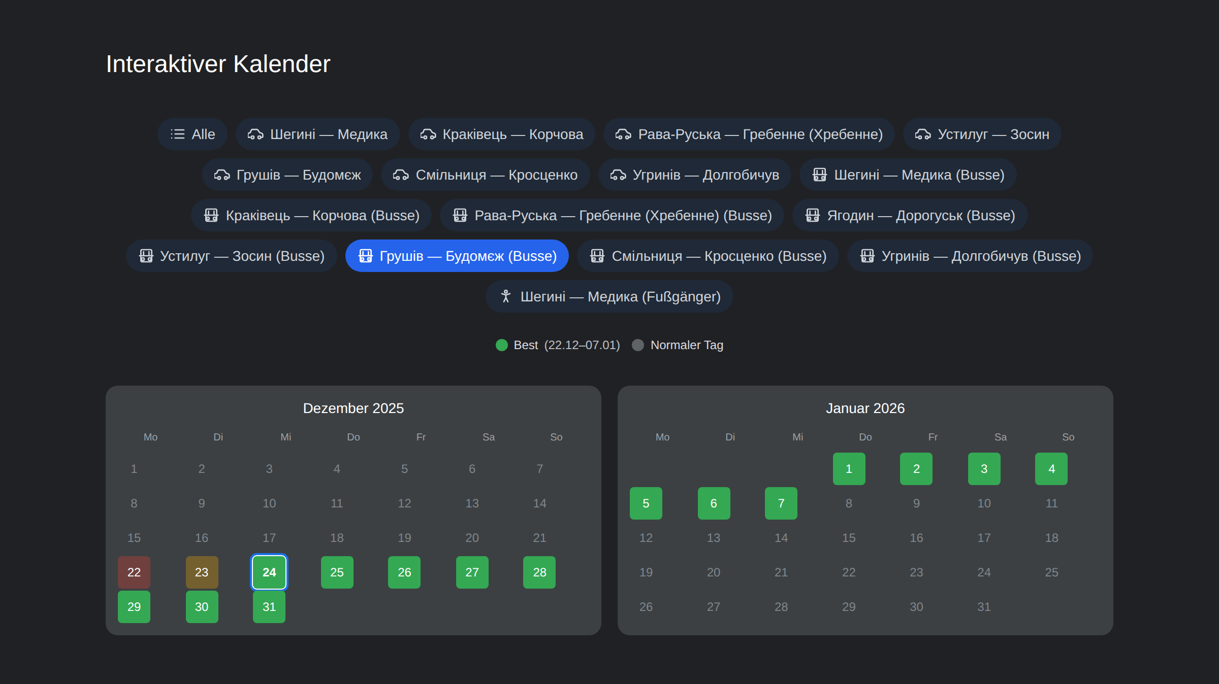 Wenn Sie vor Weihnachten (22.–23. Dezember) nach Polen oder in andere EU-Länder reisen oder Tage danach bevorzugen, sind die optimalen Daten 27., 28., 29. Dezember. Die meisten sind bereits angekommen, daher sinken die Wartezeiten auf 90–120 Minuten.