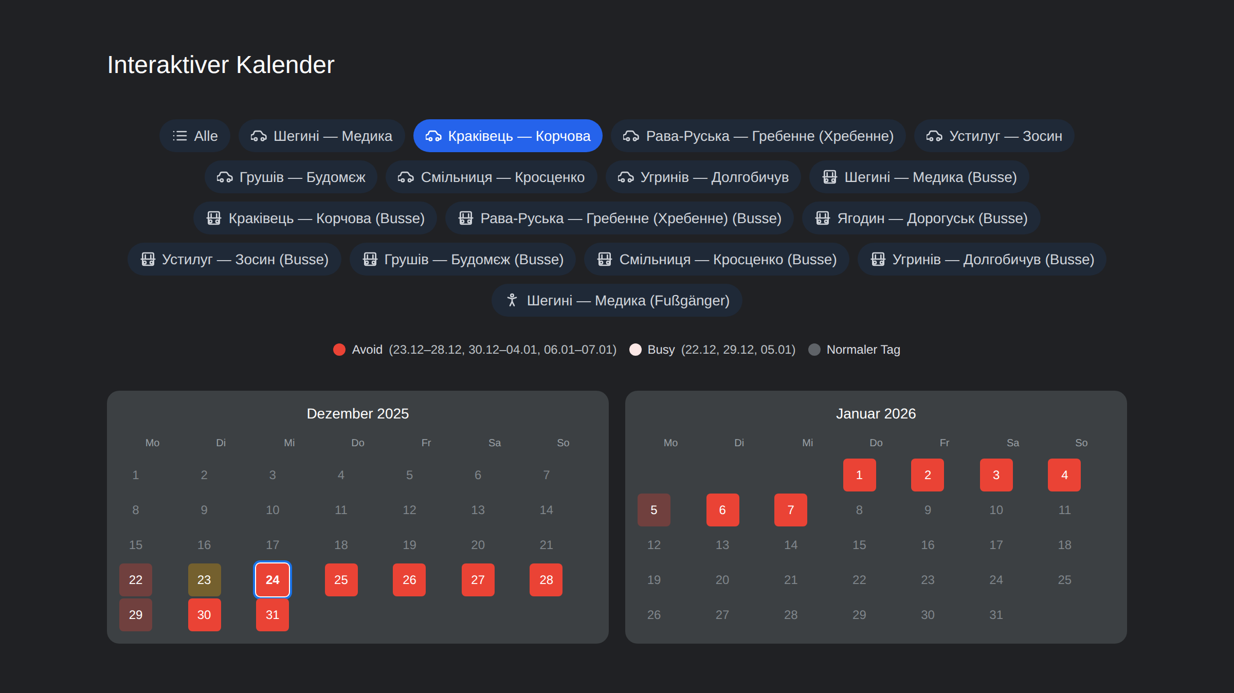 • Vermeiden: Sonntag 22.12 und Mittwoch 01.01 — 5–8 Stunden Wartezeit