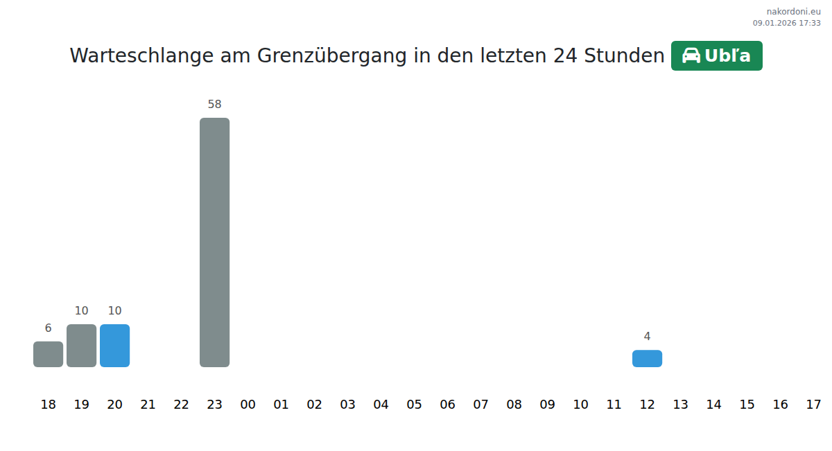Planen Sie Ihre Reisen im Voraus und nutzen Sie aktuelle Informationen über die Warteschlangen an der Grenze am Grenzübergang Ubľa - Personenkraftwagen, um Ihren Grenzübertritt schnell und bequem zu gestalten. Achten Sie besonders auf diese Stunden, um Stoßzeiten zu vermeiden und die Wartezeiten zu verkürzen.