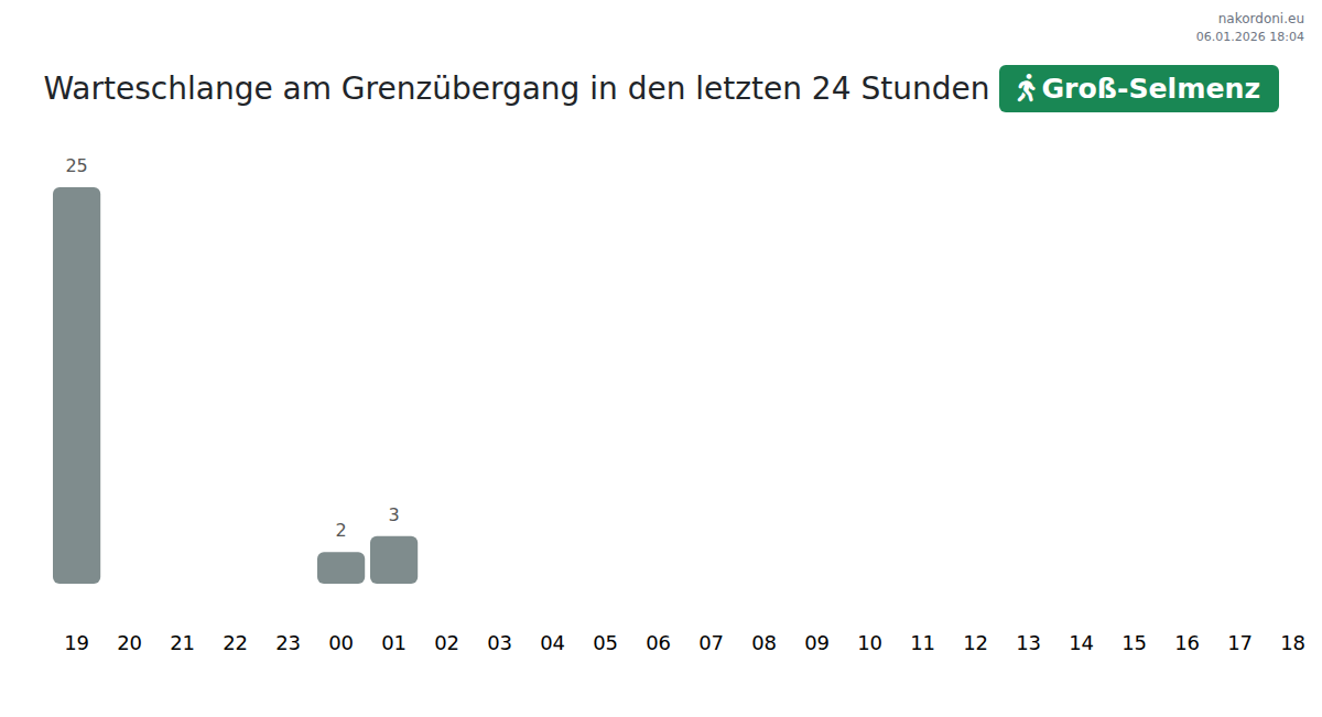 Planen Sie Ihre Reisen im Voraus und nutzen Sie aktuelle Informationen über die Warteschlangen an der Grenze am Grenzübergang Groß-Selmenz - Fußgänger, um Ihren Grenzübertritt schnell und bequem zu gestalten. Achten Sie besonders auf diese Stunden, um Stoßzeiten zu vermeiden und die Wartezeiten zu verkürzen.